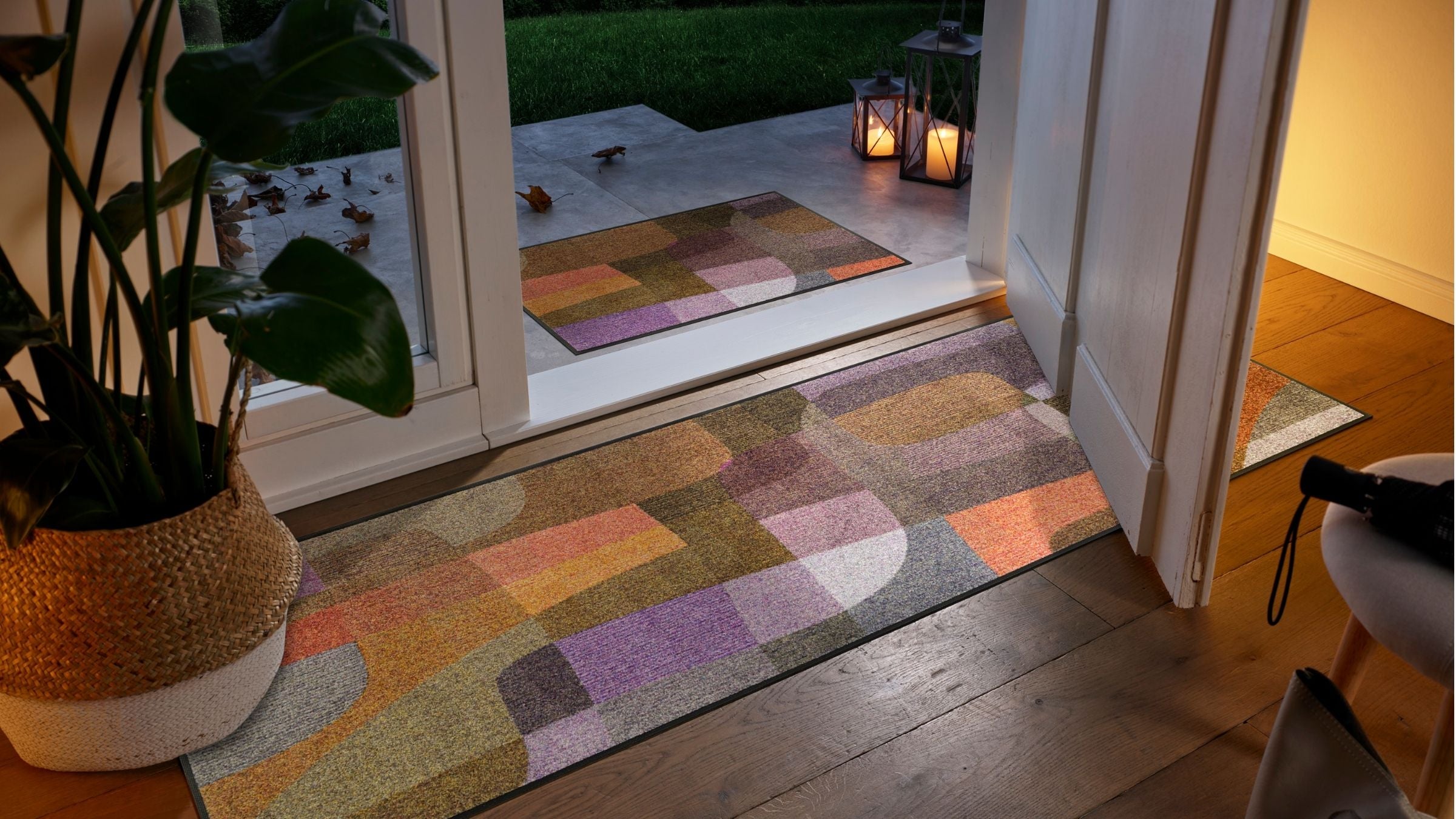 Ein geometrischer Türvorleger harmoniert besonders gut mit minimalistischen Häusern oder geradlinigen Fassaden. Die klaren Linien und ruhigen Muster betonen die Architektur, ohne sich in den Vordergrund zu drängen.