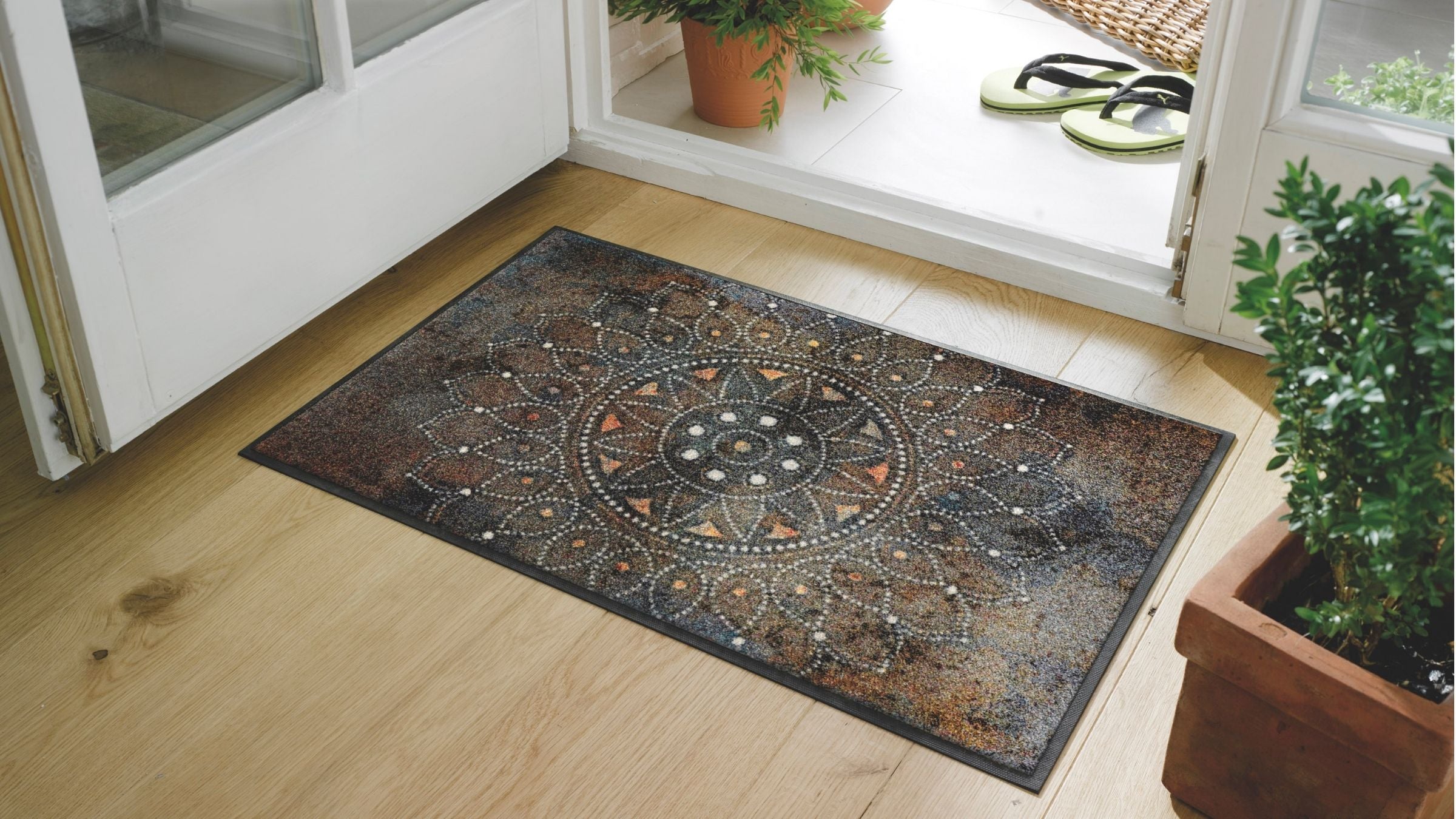 wash+dry DECOR kombiniert die hygienischen Vorteile einer Fußmatte mit der Optik eines hochwertigen Teppichs. Die Kollektion ist mit einem hochwertigen Nitrilgummirücken ausgestattet, der auf allen trockenen Hartböden für sicheren, rutschfesten Halt sorgt.